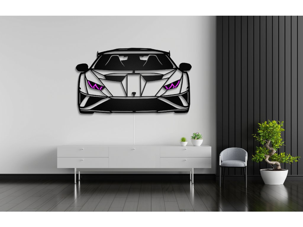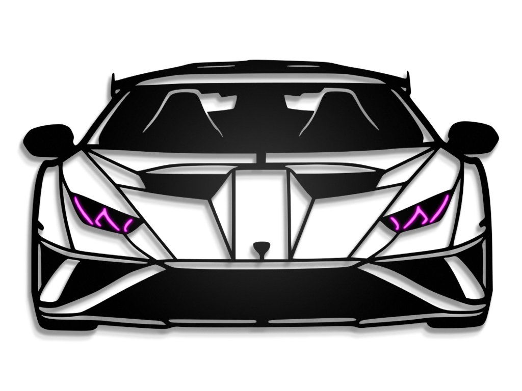 Silueta předního pohledu Lamborghini Huracán STO. Legendární ikonická světla tohoto modelu jsou vytvarována z RGB NEON LED pásků. Silueta je vyrobena z pěněné PVC desky o tloušťce 10mm. Na zadní straně jsou diody schovány pod kryty, které zároveň slouží pro odsazení siluety od zdi, což zajišťuje přirozený průchod světla a vznik stínů. To siluetě dodává 3D vzhled.