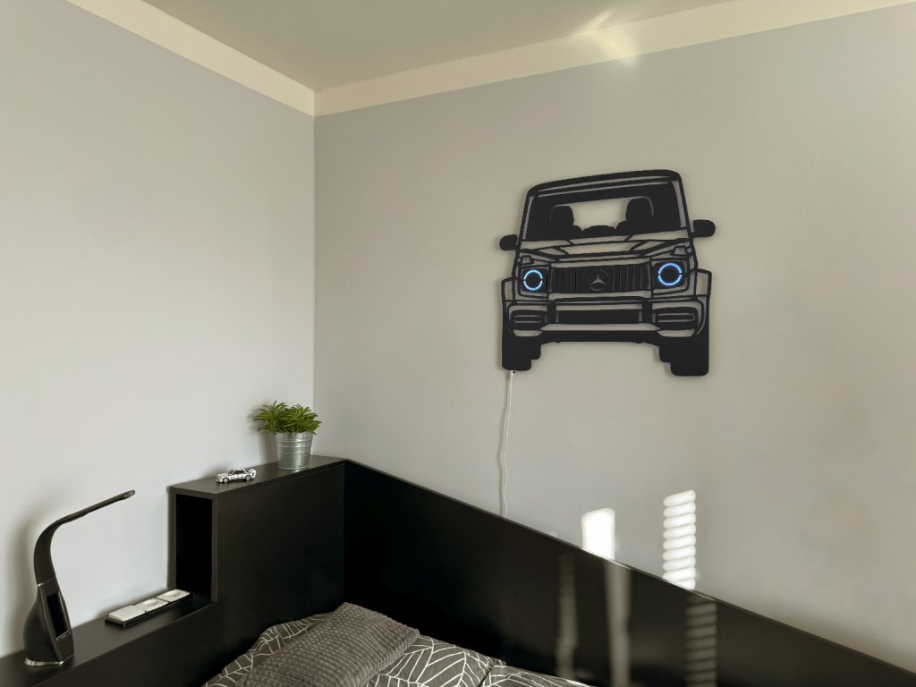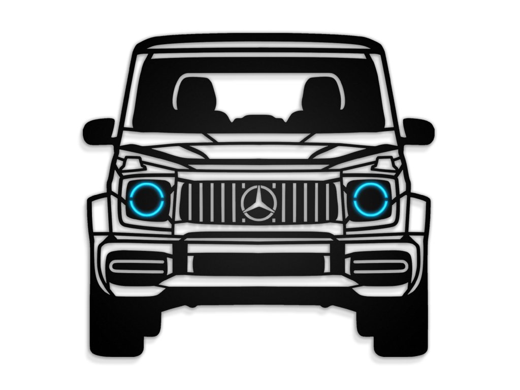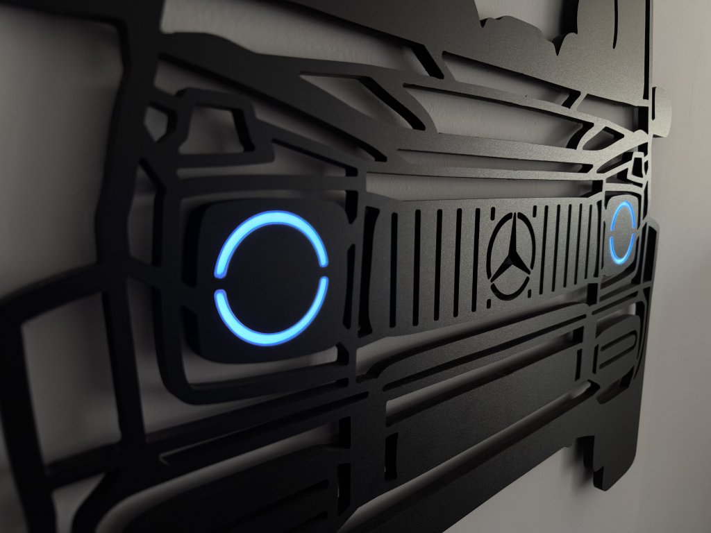 Silueta předního pohledu Mercedes-AMG G63. Legendární ikonická světla tohoto modelu jsou vytvarována z RGB NEON LED pásků. Silueta je vyrobena z pěněné PVC desky o tloušťce 10mm. Na zadní straně jsou diody schovány pod kryty, které zároveň slouží pro odsazení siluety od zdi, což zajišťuje přirozený průchod světla a vznik stínů. To siluetě dodává 3D vzhled.
